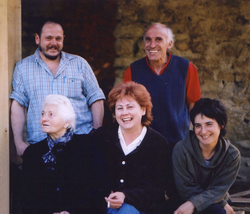 Allí me encontró la noche que suave caía sobre la altura, habiendo dejado el valle en sombras que ya subían tardías. Un lugar maravilloso que sería sueño imposible de cualquier mortal "civilizado". La imagen que sigue muestra a nuestros más inmediatos vecinos en Oba alto:María Luisa, a su lado Edurne, a la derecha Tere, esposa de Josera (biólogo), y el que suscribe